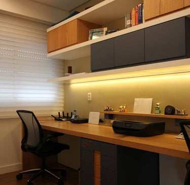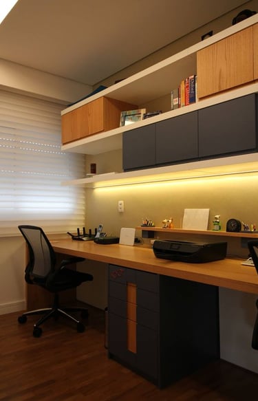 Dica: As caixas organizadoras que escondem a régua de tomada são as mais eficientes para um visual limpo.